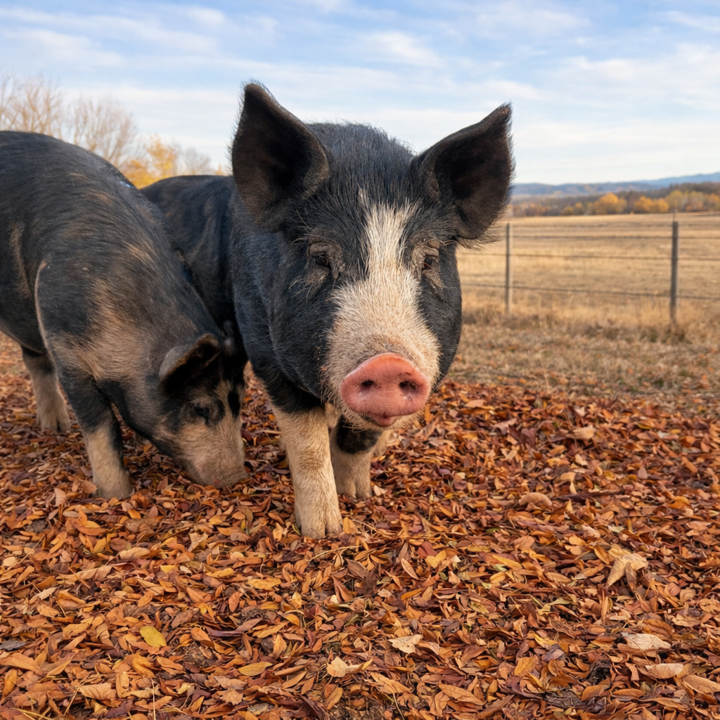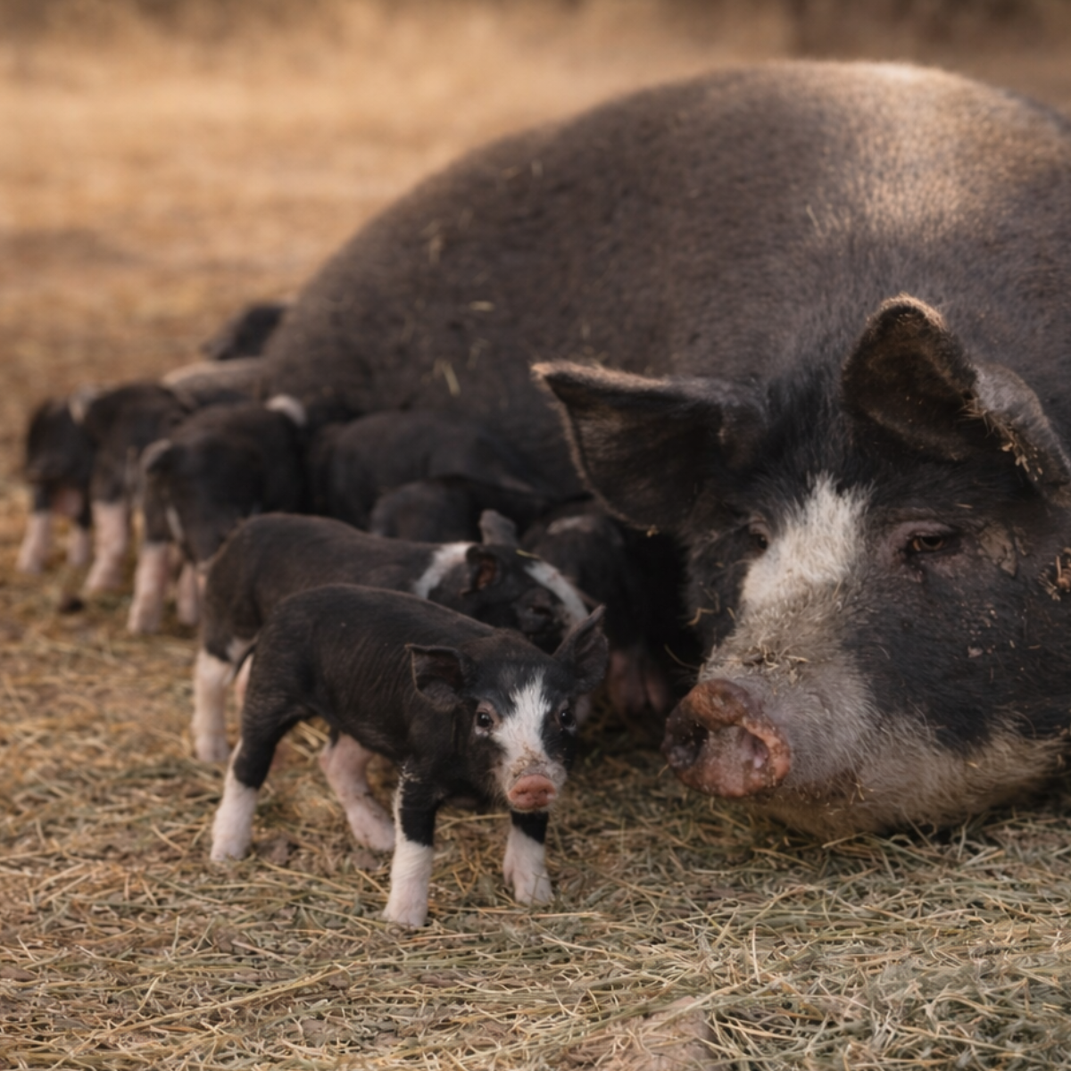 Heritage genetics (Berkshire & Berkshire -Cross): Known for exceptional marbling, tenderness, and rich flavor—chosen specifically for eating quality, not speed or scale.