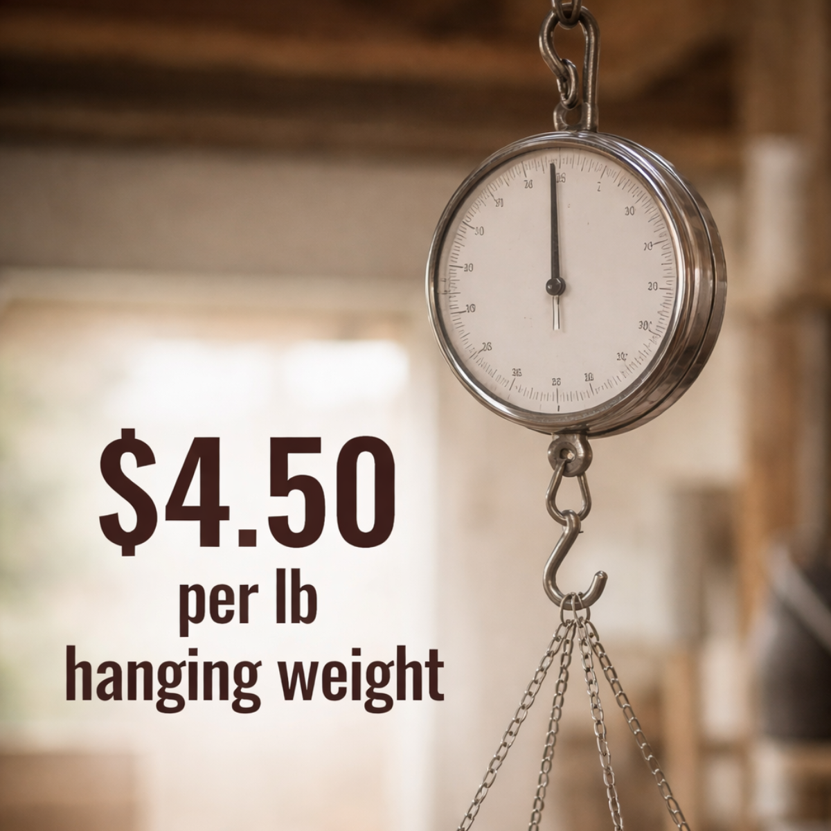 Current price: $4.50/lb hanging weight (additional processing fees paid directly to the butcher)